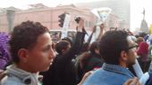 protesters holding Al Tahrir News paper, with the picture of the blue bra girl in the front page. The headline says Kazeboon "Liars"